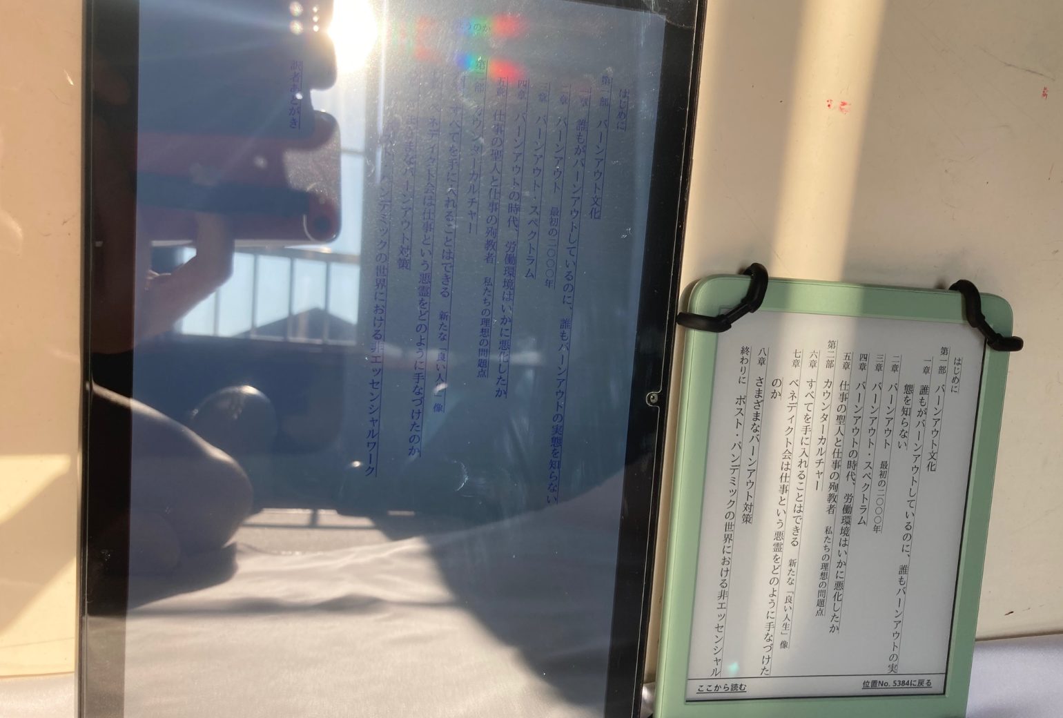 これまでタブレットで読書していたときは、朝の通勤電車で自分の顔が映り込んだり、後ろの人と画面越しに目が合ったり…とにかく明るい場所では読みづらいというデメリットがありました。